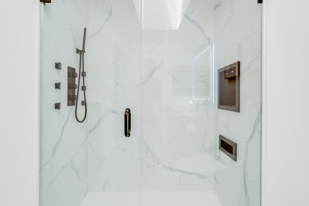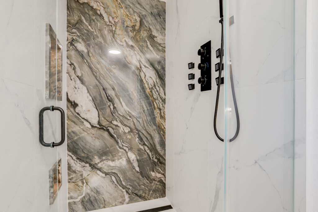 ο Stall Thermostatic shower with 6-jets and LED shower heads, granite inlays and glass door enclosures