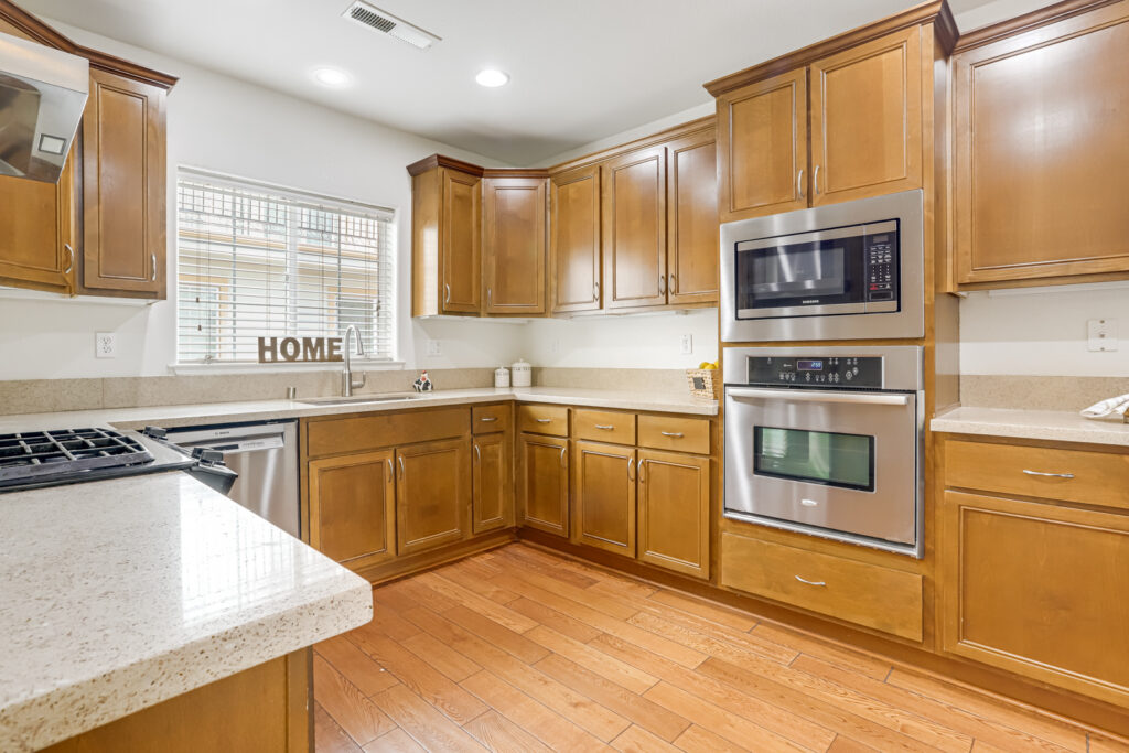 The open floor plan living room features hardwood flooring, a cozy gas fireplace, and a large sliding door leading to the front patio. The gourmet kitchen boasts granite countertops, stainless steel appliances, and a walk-in pantry.